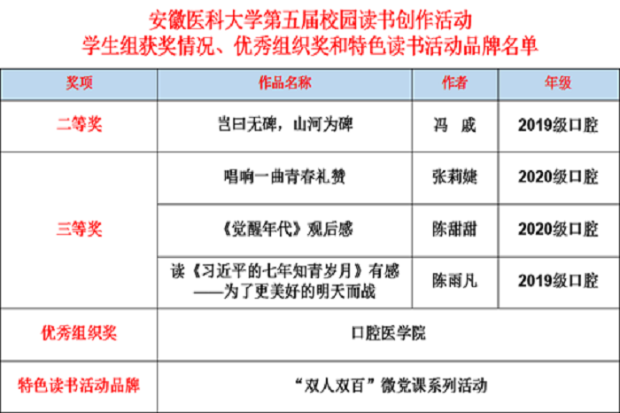 此次活动以“读书引领人生,创作点亮梦想”为宗旨,“致敬百年风华,勇担时代使命”为主题,全校人员积极参与,共征集作品 300 篇,设大学生组和教师组2个组别。经层层选拔、评审,最终,学生组中,永利 冯戚同学的征文《岂曰无碑,山河为碑》荣获学生组二等奖,张莉婕同学的《唱响一曲青春礼赞》、陈甜甜的《<觉醒年代>观后感》、陈雨凡的《唱响一曲青春礼赞》分别荣获三等奖;教师组中,修复科党支部的征文《党的路程》荣获教师组二等奖,李素琴老师报送的《白求恩精神 历久弥新 永放光芒》获得三等奖,朱艳秋、孙雅慧老师的《以史为鉴,奋进前行》和《致敬百年风华 勇担时代使命》获得优秀奖,永利 组织的“双人双百”微党课系列活动被评为“特色读书活动品牌”,永利 (医院)荣获“优秀组织奖”。