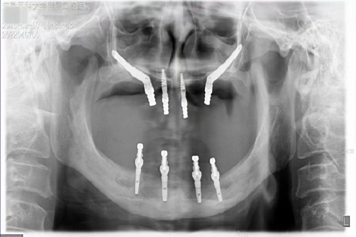 据悉,患者潘女士54岁,由于重度牙周炎导致全口牙齿缺失,严重影响面容及咀嚼功能,因颌骨严重萎缩无法进行活动义齿修复,遂来永利 种植科要求行上颌稳固的修复。通过检查发现潘女士上下颌骨骨量严重不足,经反复比对和考量,刘鑫主任制定了对患者上颌骨进行穿颧种植修复、下颌骨通过神经游离进行种植的方案。经过患者与家属深思熟虑后,接受了行穿颧种植术的建议。治疗组通过专业三维设计软件规划植体,口腔颌面外科和种植科专家共同完成了穿颧种植手术。患者术后第一天情况良好,无明显肿胀,精神状态佳。