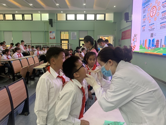 活动现场,牙体牙髓儿童牙病科医生韩良耐心为孩子们传授口腔健康知识,她从牙齿结构、刷牙技巧、窝沟封闭、牙齿保护等方面为同学们进行牙齿保健知识讲解,生动有趣、寓教于乐的讲解形式让现场的小朋友开心之余收获满满。永利 医生还与南七街道社区卫生服务中心口腔科医师一起为同学们进行了口腔健康检查。
