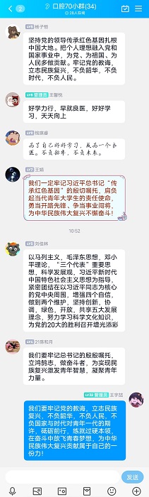 支部成员在班级群对开展的系列团日活动进行了回顾与总结,大家结合自己的思想和生活,讲体悟,谈感想,并表示将牢记党和人民的重托,不断完善自我、充实自我,提升理论水平和实践能力,在实践中学知识、长才干、做贡献。