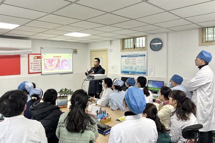 2月24日下午,永利 口腔颌面外科在四楼医生办公室开展口腔专业知识标准化培训系列学习讲座。讲座由该科室陈新主任讲授,科室医护人员、实习学生及规培医生等参加。