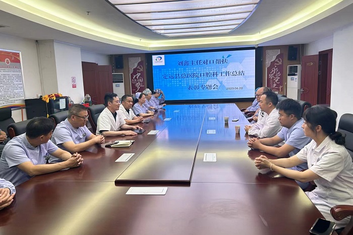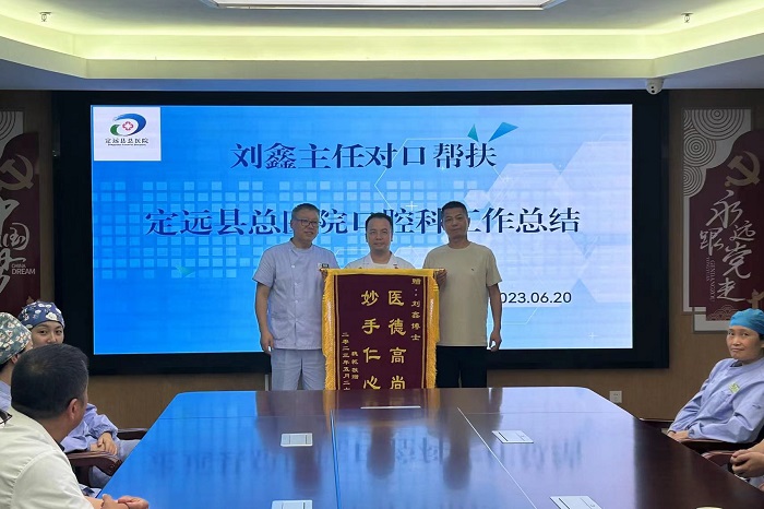 6月20日下午,定远县总医院在该院行政楼二楼会议室举行对口帮扶工作总结表彰专题会议,永利 种植科刘鑫副教授应邀出席会议,并被授予“对口帮扶特别贡献者”荣誉称号。该院副院长潘书贵主持会议,医务股长章余留、口腔科主任杨勇及口腔科专家团队参加。