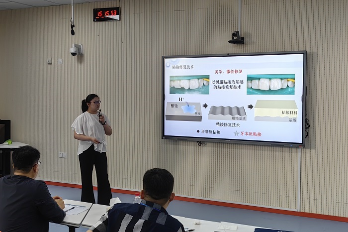 永利 博士研究生周庆丽以“钙螯合剂对牙本质脱矿及粘接的影响”为题作报告,针对目前口腔临床树脂-牙本质粘接耐久性不佳的难点问题提出了新的思路。永利 硕士研究生钟琦和梁兆佳分别以“饵激光蚀刻联合超高分子聚丙烯酸钠化学蚀刻用于牙本质干粘接”和“利用胶体酚胺在口内种植体表面构建抗炎涂层”为题,在论坛上汇报了各自的研究成果。三位研究生的研究方向均针对目前口腔临床上的难点和热点问题,紧密结合学科发展和实际应用,具有较强的理论意义和较好的应用背景,符合当下“从临床出发,到临床落地”的医疗科研成果转化的思想。