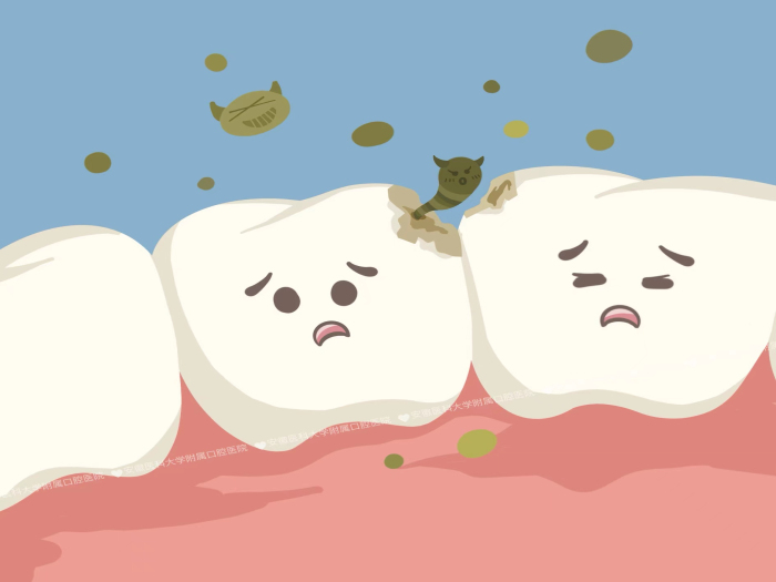2.龋齿。相邻两颗牙齿邻面有龋洞,出现的“大黑洞”,导致食物残渣容易卡在牙缝中。