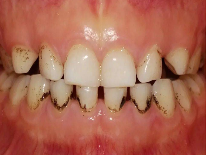 长期吸烟:烟草中的尼古丁、烟焦油等物质会黏附在牙齿表面,使牙齿变黄,甚至变成黄褐色。