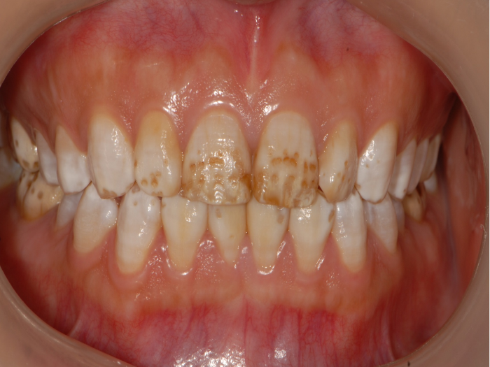 氟斑牙,又称氟牙症或斑釉,是由于从小(7岁之前)生活在高氟地区,在牙釉质发育期间长期摄入含氟较高的水或者食物,造成牙釉质色素沉着,呈黄白色斑点,严重的会伴有牙体缺损。氟斑牙一般在恒牙上出现,乳牙很少出现。