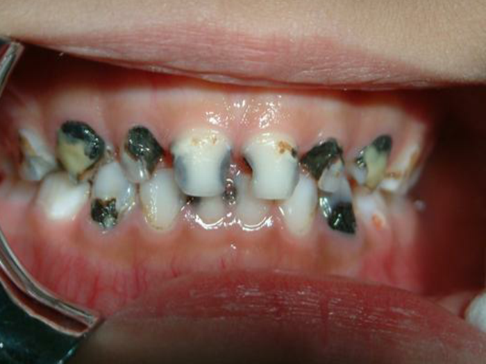 四环素牙,四环素是一类治疗细菌感染的药物,对发育中的牙齿具有染色作用,从前医学界没有重视到四环素对牙齿的染色作用,现在这类药物已经不用于儿童和孕妇了,但是仍有父母缺少这方面的知识,盲目应用四环素类药物,所以目前在儿童中仍可见四环素牙。这种病虽然称为四环素牙,但实际上不仅是四环素可以引起,像土霉素、金霉素、去甲金霉素等药物也可引起四环素牙,因为这些药物的结构与四环素相似,在医学上同属四环素药物家族。这其中四环素和去甲金霉素引起变色的作用最强。它们破坏牙齿是在牙齿发育的矿化期间产生的,这时进入人体的四环素与牙齿中的钙相结合,形成稳定的物质,影响牙体硬组织的矿化,引起牙釉质发育不全。