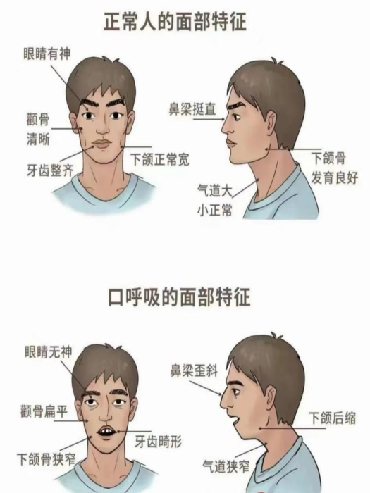 1.面容改变。经常无意识的张着嘴呼吸,相对应的就会减少鼻腔的使用,从而导致面容拉长,同时鼻子变塌,开唇露齿、嘴唇松弛无力、外翻;下颌骨下降、舌位置下降引起颧骨发育不良、不够突出,也就是我们俗称的“口呼吸面容”。