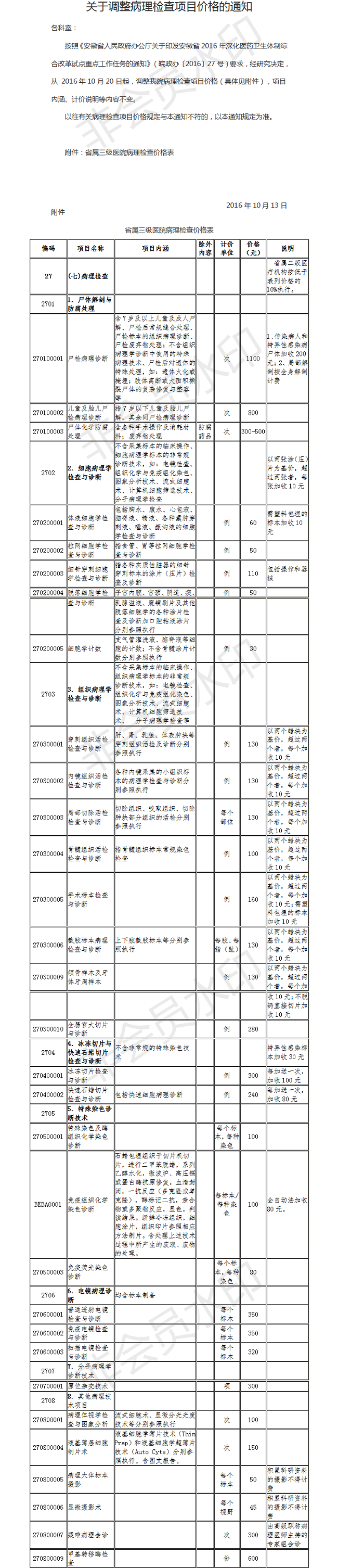 关于调整病理检查项目价格的通知