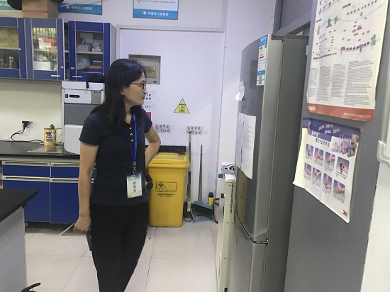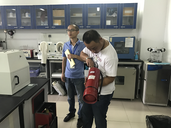 的危险化学品按照国家标准进行了规范化贮存和管理,实行严格双人双锁的管理方法,获得督察组老师们的高度肯定。实验室卫生条件良好,物品摆放规整,消防设施齐全定期更换,仪器维护和使用合理,《实验室安全检查记录》和《精密仪器使用记录表》填写完整。但也发现了部分问题。包括实验室部分耗材随意堆放;实验室仪器存放密度大、同时运行产热过多、存有安全隐患;部分自行配置的试剂溶液标签不明。检查过程中,督察组老师对实验室安全管理提出了具体要求。