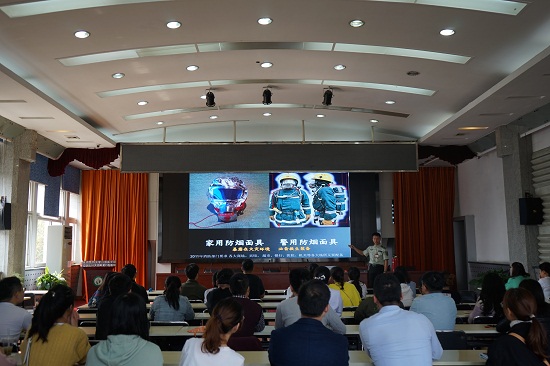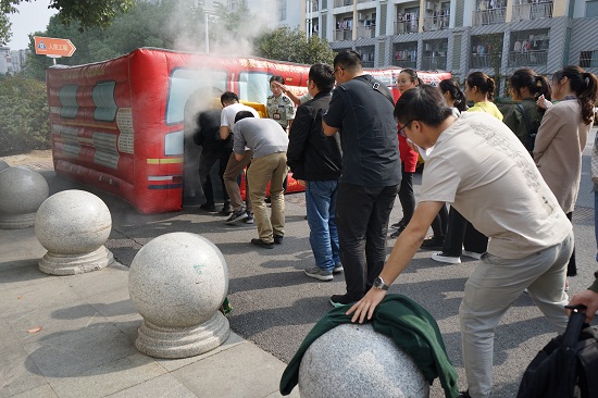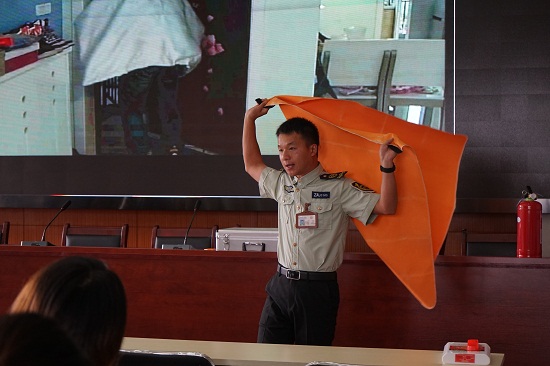 在教官和工作人员的指导下,新进员工还现场学习了如何佩戴烟雾自救呼吸器和灭火器、灭火毯、应急灯、逃生锤等消防器材的性能及正确使用方法。
