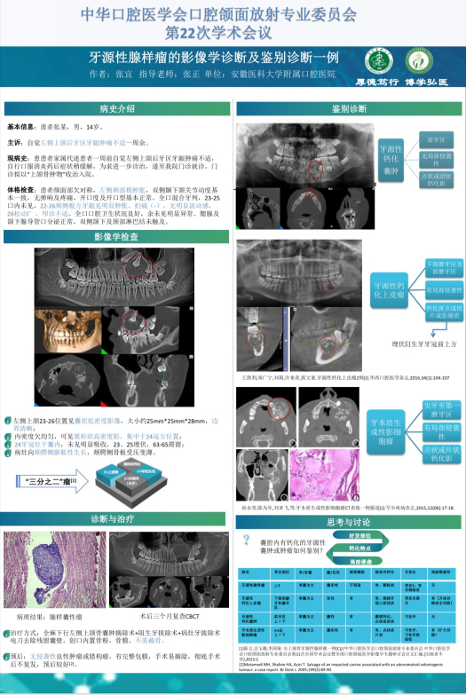 会上,永利 放射科团队展示了壁报《牙源性腺样瘤的影像学诊断及鉴别诊断一例》和《多骨性骨纤维异常增殖症一例》。前者展示了较为典型的牙源性腺样瘤,通过其影像学表现、诊断与治疗过程,同具有相似影像表现的牙源性钙化囊肿、牙源性钙化上皮瘤及牙本质生成性影细胞瘤等作出了详细的鉴别诊断说明。后者通过多骨性骨纤维异常增殖症的影像学检查,介绍了骨纤维异常增殖症的不同影像学特征;并与骨囊肿、骨巨细胞瘤、非骨化性纤维瘤等作出了详细的鉴别诊断说明。两幅壁报的展示赢得了与会专家的高度认可和广泛赞誉,分别获得三等奖、优秀奖。